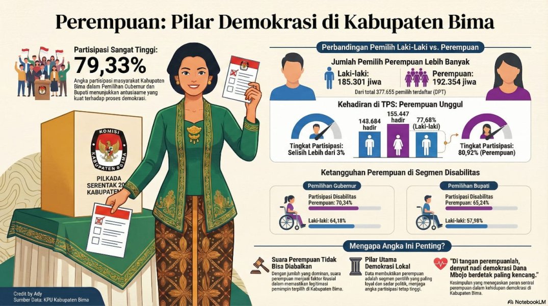 Oleh :  Ady Supriadin (Ketua KPU Kabupaten Bima) Pesta demokrasi Pemilihan Serentak 2024 di Kabupaten Bima telah usai, namun data yang tertinggal menyisakan cerita menarik tentang siapa sebenarnya yang memegang kendali di bilik suara. Jika selama ini politik identik dengan dunia laki-laki, data terbaru justru menunjukkan fakta sebaliknya: perempuan adalah penggerak utama demokrasi di Dana Mbojo. Secara umum, partisipasi masyarakat di Kabupaten Bima tergolong sangat tinggi, mencapai angka 79,33% baik untuk Pemilihan Gubernur maupun Bupati,. Namun, jika kita membedah angka tersebut lebih dalam, akan terlihat sebuah pola dominasi yang konsisten dari pemilih perempuan. Bukan Sekadar Angka, Tapi Bukti Nyata Dari total 377.655 pemilih yang terdaftar dalam DPT, pemilih perempuan berjumlah 192.354 orang, lebih banyak dibandingkan laki-laki yang berjumlah 185.301 orang. Menariknya, antusiasme perempuan tidak hanya besar di atas kertas. Realitanya, sebanyak 155.447 perempuan hadir memberikan suara di TPS, sedangkan laki-laki hanya mencapai 143.684 orang,. Secara persentase, tingkat partisipasi perempuan di Kabupaten Bima menyentuh angka 80,92%, unggul jauh dibandingkan tingkat partisipasi laki-laki yang berada di angka 77,68%. Selisih lebih dari 3% ini menegaskan bahwa perempuan memiliki kesadaran politik yang lebih tinggi dan lebih berkomitmen untuk menggunakan hak pilihnya demi masa depan daerah. Ketangguhan Perempuan di Segala Lini Dominasi ini semakin terlihat jelas jika kita melihat data pemilih disabilitas. Di kategori ini pun, perempuan kembali menunjukkan taringnya. Pada Pemilihan Gubernur dan Wakil Gubernur, tingkat partisipasi perempuan disabilitas mencapai 70,34%, sementara laki-laki hanya 64,18%. Pola yang sama terulang pada Pemilihan Bupati dan Wakil Bupati. Meskipun secara keseluruhan partisipasi disabilitas sedikit menurun, perempuan tetap memimpin dengan angka 65,24%, jauh melampaui laki-laki yang hanya mencapai 57,90%. Data ini menunjukkan bahwa keterbatasan fisik bukan penghalang bagi perempuan Bima untuk berpartisipasi aktif dalam menentukan pemimpin mereka. Analisis: Mengapa Ini Penting? Tingginya partisipasi perempuan ini bukan sekadar statistik untuk laporan di atas meja. Ini adalah sinyal tegas bahwa suara perempuan tidak bisa lagi dipandang sebelah mata. Dengan jumlah suara sah yang mencapai 292.151 untuk Gubernur dan 296.132 untuk Bupati, peran perempuan dalam memastikan legitimasi pemimpin terpilih sangatlah krusial,. Dominasi perempuan di bilik suara menunjukkan bahwa mereka adalah segmen pemilih yang paling loyal dan sadar akan pentingnya proses demokrasi. Mereka bukan hanya pelengkap, melainkan pilar utama yang menjaga angka partisipasi di Kabupaten Bima tetap tinggi di atas rata-rata nasional. Kesimpulannya, jika ingin melihat wajah demokrasi yang hidup dan berenergi di Kabupaten Bima, lihatlah barisan perempuan di depan TPS. Data telah berbicara: di tangan perempuanlah, denyut nadi demokrasi Dana Mbojo berdetak paling kencang.