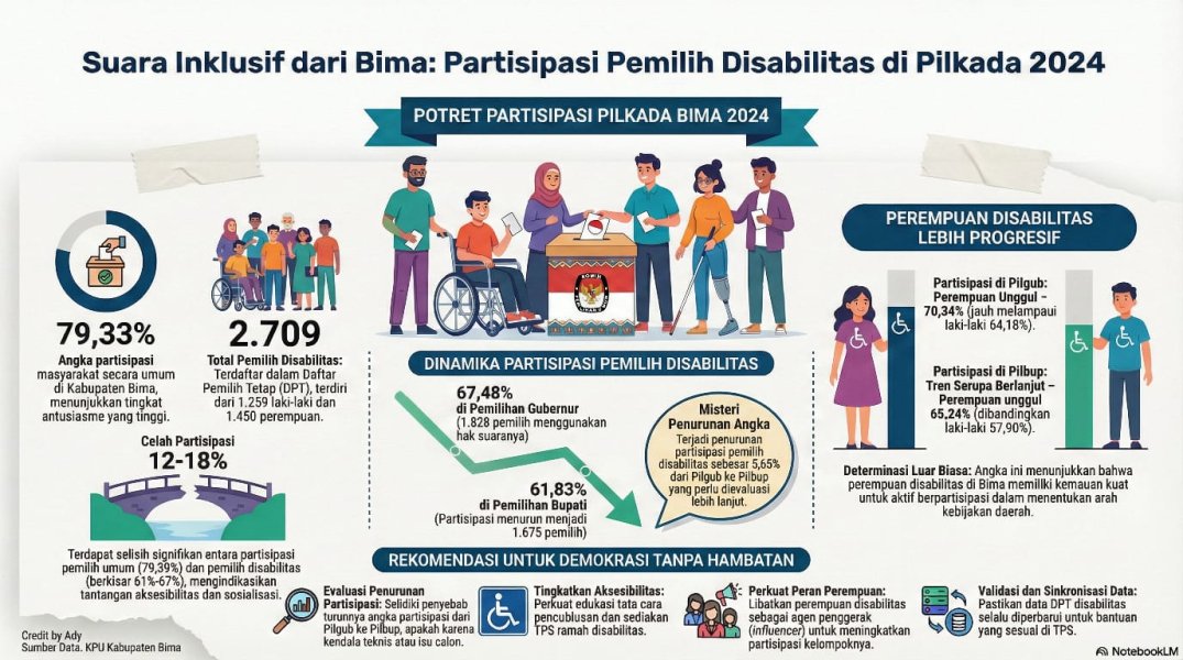 Oleh : Ady Supriadin (Ketua KPU Kabupaten Bima) Demokrasi yang sehat bukan hanya soal seberapa banyak orang datang ke TPS, tapi seberapa ramah sistem tersebut bagi seluruh lapisan masyarakat, termasuk kawan-kawan disabilitas. Di Kabupaten Bima, perhelatan Pemilihan Serentak 2024 memberikan potret menarik tentang bagaimana aspek inklusivitas ini bekerja di lapangan. Secara keseluruhan, Kabupaten Bima mencatatkan angka partisipasi masyarakat yang cukup impresif, yakni 79,33%,. Namun, jika kita mengalihkan lensa pada kelompok disabilitas, ada dinamika angka yang perlu kita bedah bersama untuk memahami sejauh mana "panggung" politik kita sudah benar-benar inklusif. Angka yang Berbicara Berdasarkan data DPT, terdapat 2.709 pemilih disabilitas di Kabupaten Bima yang terdiri dari 1.259 laki-laki dan 1.450 perempuan,. Dari jumlah tersebut, antusiasme mereka untuk hadir di bilik suara patut diacungi jempol, meski terdapat sedikit perbedaan kontras antara jenis pemilihan yang diikuti. Pada Pemilihan Gubernur dan Wakil Gubernur, tingkat partisipasi pemilih disabilitas mencapai 67,48%. Artinya, sebanyak 1.828 orang menyalurkan hak suaranya. Namun, angka ini mengalami penurunan pada Pemilihan Bupati dan Wakil Bupati, di mana partisipasi berada di angka 61,83% dengan total 1.675 pemilih. Ada sebuah fenomena menarik di sini: pemilih perempuan disabilitas tampil lebih progresif. Pada Pemilihan Gubernur, partisipasi perempuan disabilitas menyentuh 70,34%, jauh melampaui laki-laki yang berada di angka 64,18%. Tren serupa terjadi di Pemilihan Bupati, di mana perempuan tetap unggul dengan 65,24% dibanding laki-laki yang hanya 57,90%. Ini menunjukkan bahwa perempuan disabilitas di Bima memiliki determinasi yang luar biasa dalam menentukan arah kebijakan daerah ke depan. Antara Harapan dan Realita Jika dibandingkan dengan tingkat partisipasi pemilih umum yang mencapai hampir 80%, partisipasi kelompok disabilitas yang berkisar di angka 61% hingga 67% ini menunjukkan masih adanya "celah",. Selisih sekitar 12-18% ini menjadi indikator bahwa aksesibilitas dan sosialisasi khusus mungkin belum sepenuhnya menjangkau seluruh kawan-kawan disabilitas. Meskipun begitu, kehadiran ribuan pemilih disabilitas di TPS adalah bukti nyata bahwa semangat inklusivitas mulai tumbuh subur di Dana Mbojo. Mereka bukan lagi objek politik, melainkan subjek aktif yang suaranya turut menentukan legitimasi pemimpin terpilih. Catatan Evaluatif untuk Pilkada Masa Depan di Bima Berdasarkan data di atas, ada beberapa poin penting yang perlu menjadi perhatian penyelenggara pemilu (KPU/Bawaslu) serta Pemerintah Daerah ke depannya: 1. Misteri Penurunan Angka: Perlu dievaluasi mengapa partisipasi disabilitas menurun dari 67,48% pada Pemilihan Gubernur menjadi 61,83% pada Pemilihan Bupati,. Apakah ada kendala teknis di TPS atau kurangnya daya tarik visi-misi calon bupati terhadap isu disabilitas? Hal ini penting agar di masa depan, angka partisipasi tetap stabil atau bahkan meningkat di semua jenis pemilihan. 2. Aksesibilitas Fisik dan Non-Fisik: Dengan jumlah suara tidak sah yang masih ditemukan (8.667 untuk Gubernur dan 4.673 untuk Bupati secara umum), edukasi mengenai tata cara pencoblosan bagi disabilitas perlu ditingkatkan agar hak suara mereka terkonversi menjadi suara sah secara maksimal,. 3. Memperkuat Peran Perempuan: Mengingat tingginya partisipasi perempuan disabilitas, program pemberdayaan dan sosialisasi politik ke depan bisa lebih melibatkan mereka sebagai agen penggerak (influencer) bagi kelompok disabilitas lainnya. 4. Data sebagai Kunci: Sinkronisasi data DPT disabilitas dengan kondisi riil di lapangan harus terus diperbarui untuk memastikan setiap individu mendapatkan bantuan yang diperlukan saat berada di TPS, mulai dari alat bantu coblos hingga fasilitas ramah kursi roda. Langkah inklusif di Bima sudah dimulai, namun perjalanan menuju demokrasi yang benar-benar tanpa hambatan masih memerlukan kerja keras kolektif. Jangan sampai ada satu pun suara yang tertinggal hanya karena kendala akses.