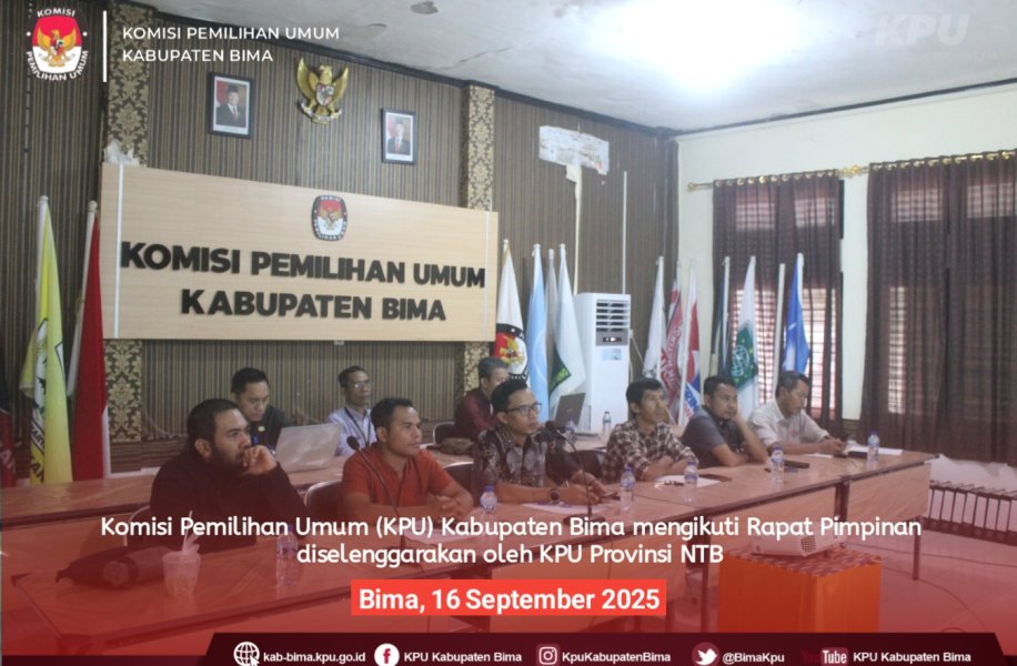 Bima, 16 September 2025 – Komisi Pemilihan Umum (KPU) Kabupaten Bima mengikuti Zoom Meeting Rapat Pimpinan yang diselenggarakan KPU Provinsi NTB bersama KPU Kabupaten/Kota se-NTB, Selasa (16/9).