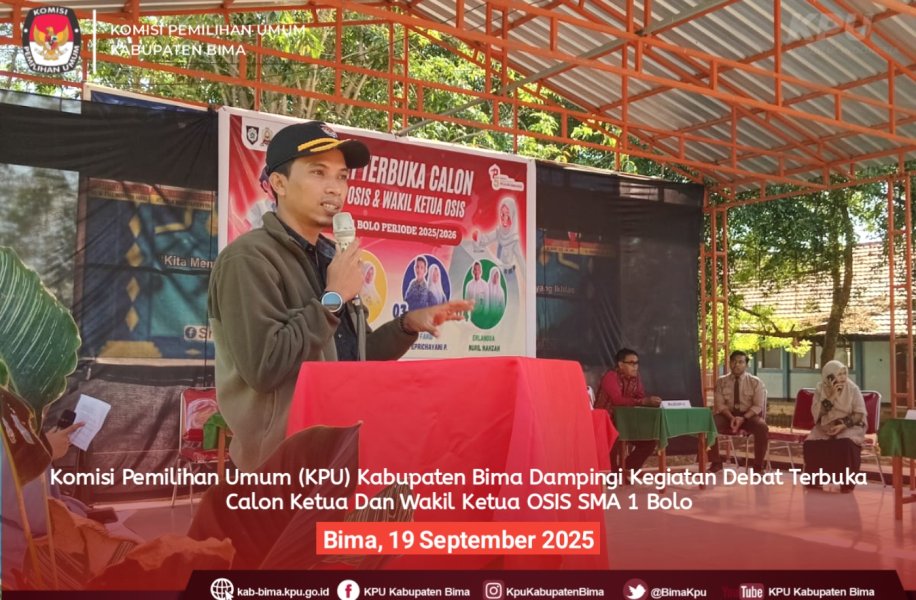 Bima – Ketua KPU Kabupaten Bima, Ady Supriadin, S.Pd.I, menghadiri kegiatan Debat Terbuka Calon Ketua dan Wakil Ketua OSIS di SMAN 1 Bolo, Jum’at (19/9).