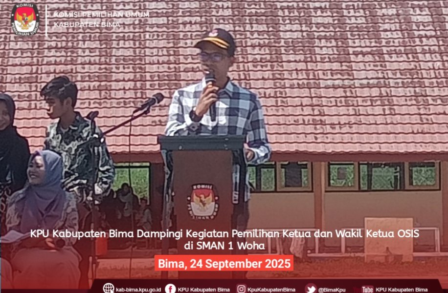 Bima – Ketua KPU Kabupaten Bima, Ady Supriadin, S.Pd.I mendampingi jalannya kegiatan Debat Terbuka Calon Ketua dan Wakil Ketua OSIS SMAN 1 Woha yang digelar di halaman sekolah setempat, Rabu (24/09).