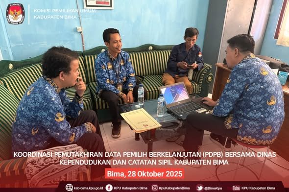 Bima, 28 Oktober 2025 — Komisi Pemilihan Umum (KPU) Kabupaten Bima melaksanakan kegiatan koordinasi Pemutakhiran Data Pemilih Berkelanjutan (PDPB) Triwulan IV Tahun 2025 bersama Dinas Kependudukan dan Pencatatan Sipil (Dukcapil) Kabupaten Bima.