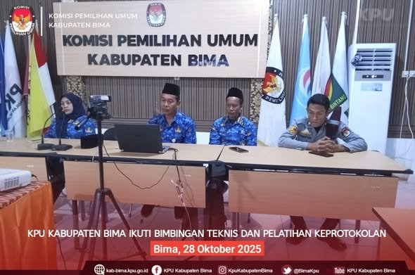#TemanPemilih Selasa, 28 Oktober 2025, KPU Kabupaten Bima mengikuti Zoom Meeting Bimbingan Teknis (Bimtek) dan Pelatihan Keprotokolan bagi pejabat serta pelaksana di lingkungan Sekretariat Komisi Pemilihan Umum Provinsi dan Kabupaten/Kota se-Nusa Tenggara Barat.