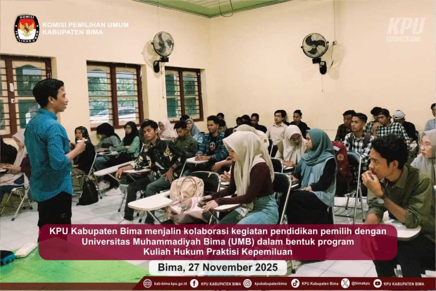 KPU Kabupaten Bima menjalin kolaborasi kegiatan pendidikan pemilih dengan Universitas Muhammadiyah Bima (UMB) dalam bentuk program Kuliah Hukum Praktisi Kepemiluan. Agenda perdana dilaksanakan pada Kamis (27/11) siang di Kampus Utama UMB dengan peserta mahasiswa Fakultas Hukum Semester V.
