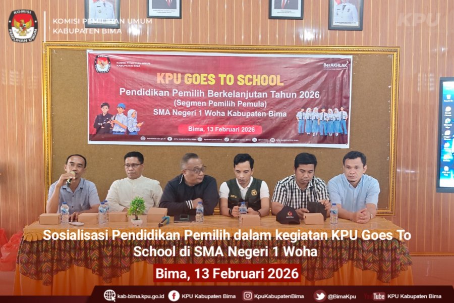 Dalam rangka pelaksanaan program Pendidikan Pemilih Berkelanjutan Tahun 2026, Komisi Pemilihan Umum (KPU) Kabupaten Bima melaksanakan kegiatan KPU Goes to School dengan segmen pemilih pemula di SMA Negeri 1 Woha, Kabupaten Bima. Jumat 13 Februari 2026