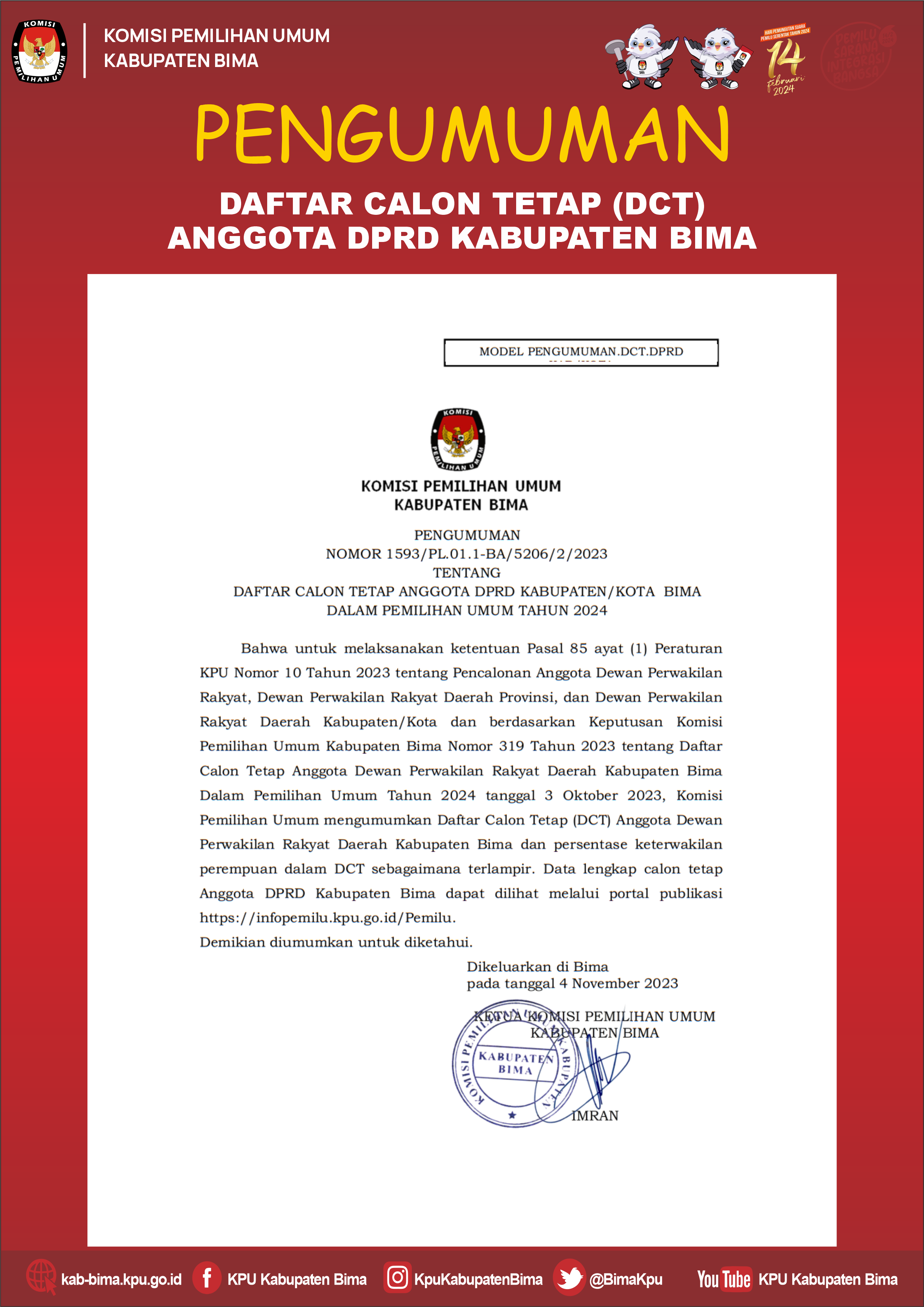 Berikut Kami Sampaikan Pengumuman Daftar Calon Tetap (DCT) Anggota Dewan Perwakilan Rakyat Daerah Kabupaten Bima Pada Pemilu 2024.
