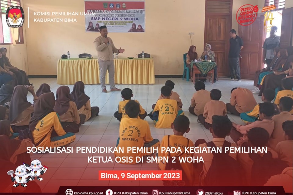 Ketua KPU Kabupaten Bima Imran memberikan pendidikan pemilih pada siswa SMPN 2 Woha dalam kegiatan Pemilihan Ketua OSIS Sabtu, 9 September 2023 bertempat di aula sekolah setempat.