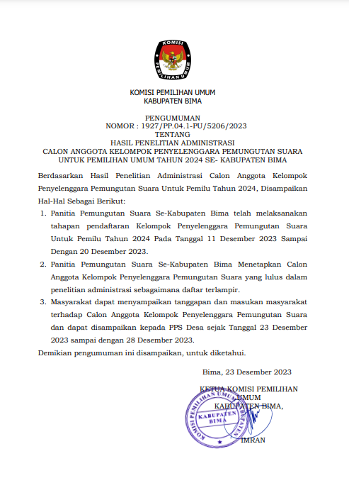 PENGUMUMAN HASIL PENELITIAN ADMINISTRASI CALON ANGGOTA KELOMPOK PENYELENGGARA PEMUNGUTAN SUARA UNTUK PEMILIHAN UMUM TAHUN 2024 SE- KABUPATEN BIMA