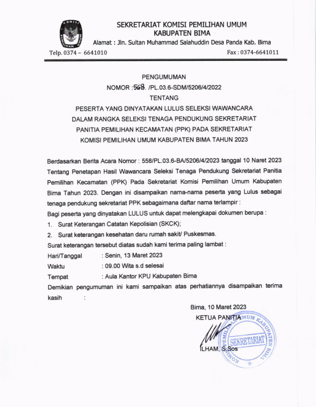 PESERTA YANG DINYATAKAN LULUS SELEKSI WAWANCARA DALAM RANGKA SELEKSI TENAGA PENDUKUNG SEKRETARIAT PANITIA PEMILIHAN KECAMATAN (PPK) PADA SEKRETARIAT KOMISI PEMILIHAN UMUM KABUPATEN BIMA TAHUN 2023