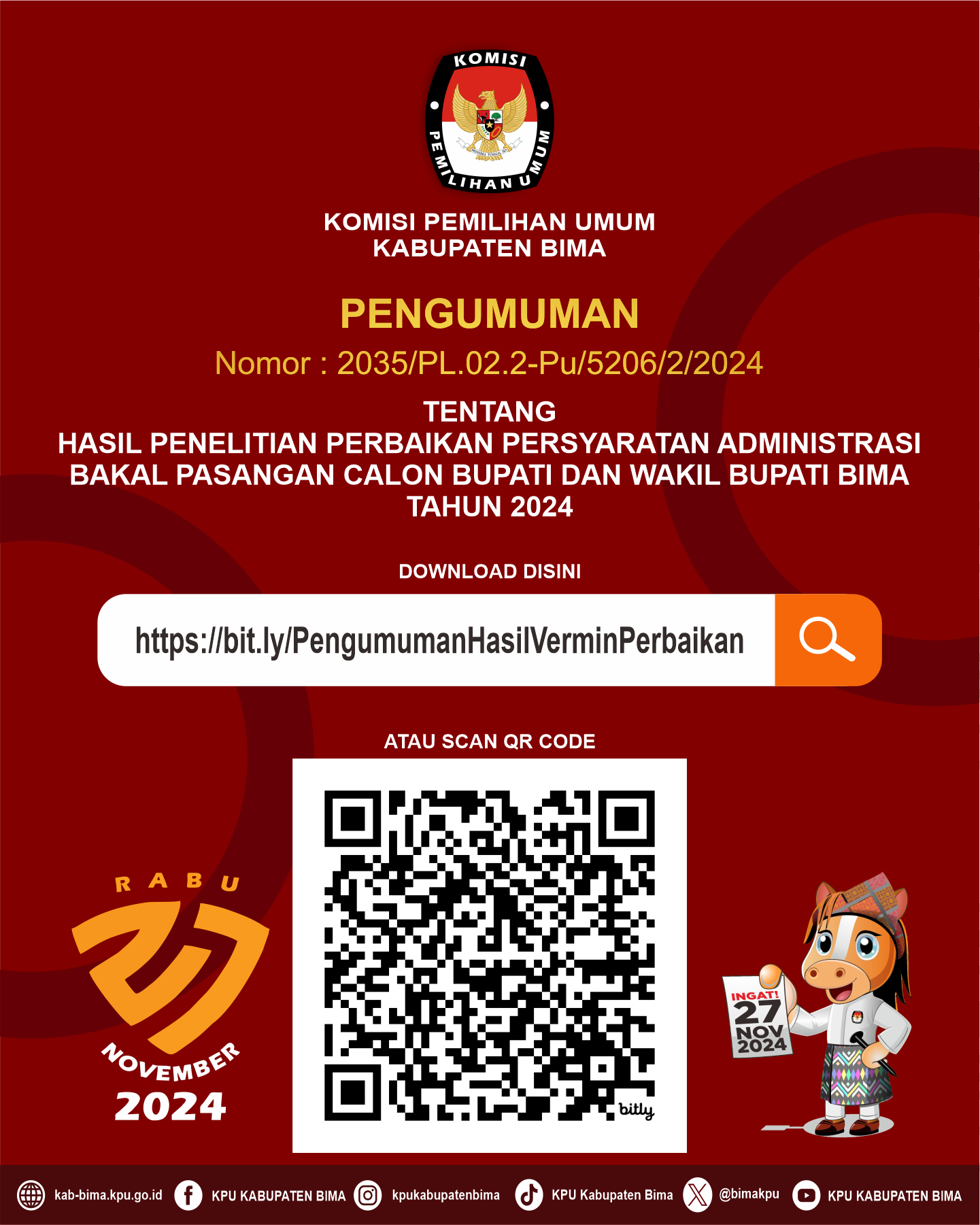 PENGUMUMAN TENTANG HASIL PENELITIAN PERBAIKAN PERSYARATAN ADMINISTRASI BAKAL PASANGAN CALON BUPATI DAN WAKIL BUPATI BIMA TAHUN 2024