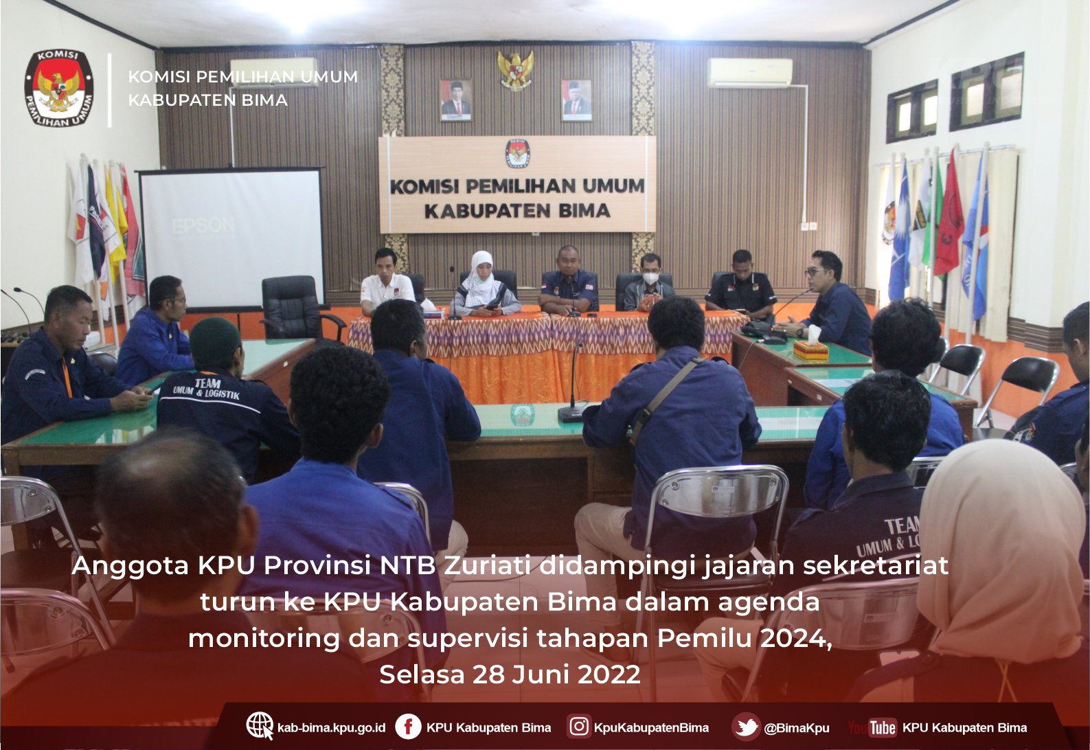 Anggota KPU Provinsi NTB Zuriati didampingi jajaran sekretariat turun ke KPU Kabupaten Bima dalam agenda monitoring dan supervisi tahapan Pemilu 2024, Selasa 28 Juni 2022.